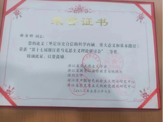5月27--28日,由浙江省马克思主义学会、浙江省教育厅宣传教育处、浙江省中国特色社会主义理论研究中心、浙江省马克思主义执政党建设研究中心与温州大学联合主办的第十七届浙江省马克思主义理论研讨会暨2023年浙江省马克思主义学会年会在温州召开。此次研讨会共收到省内外参评论文334篇,其中一等奖6篇,二等奖9篇,三等奖16篇,优秀奖36篇。我校马克思主义学院徐治彬教授作为学校代表出席此次研讨会,其论文《坚定历史自信的科学内涵、重大意义和基本路径》荣获年会优秀论文二等奖。
