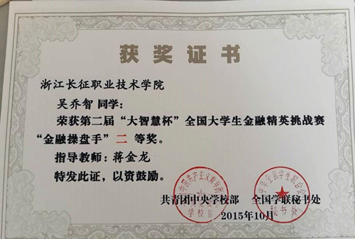 指导老师蒋金龙在本次比赛中荣获高校金融操盘手指导教师二等奖