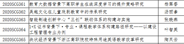 经学校指导,省专家评审,我校张晓燕等5位老师负责申报的五个项目获浙江省教育科学规划2020年度课题立项。据浙江省教育科学规划领导小组办公室文件《关于公布浙江省教育科学规划2020年度各类课题的通知》(浙教科规办〔2020〕2号),名单如下: