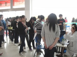 同学们排队积极参加献血活动